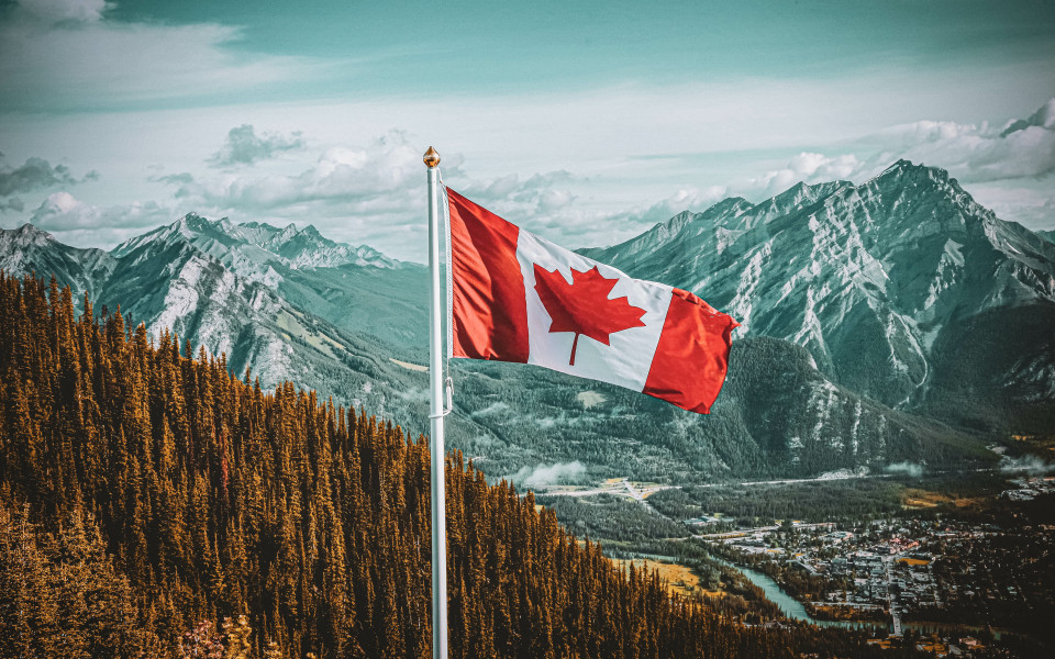 Kanadische Flagge mit Bergen im Hintergrund